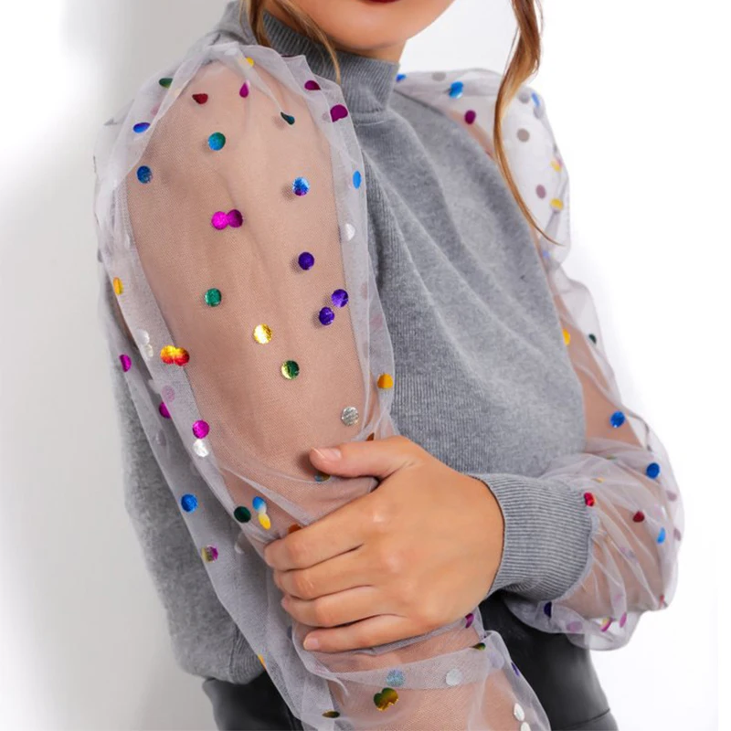 amazing Sexy See-Through Patchwork Mesh Shirt Elegant Women Ribbed Slim Blouse Tops Autumn Puff Long Sleeve