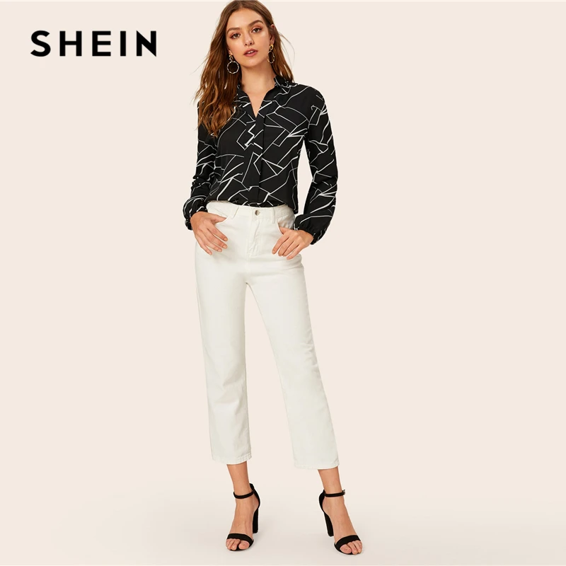 amazing SHEIN Turn Down Collar Random Stripe Print Elegant Blouse Shirt Women Tops 2019 Autumn Black Long S