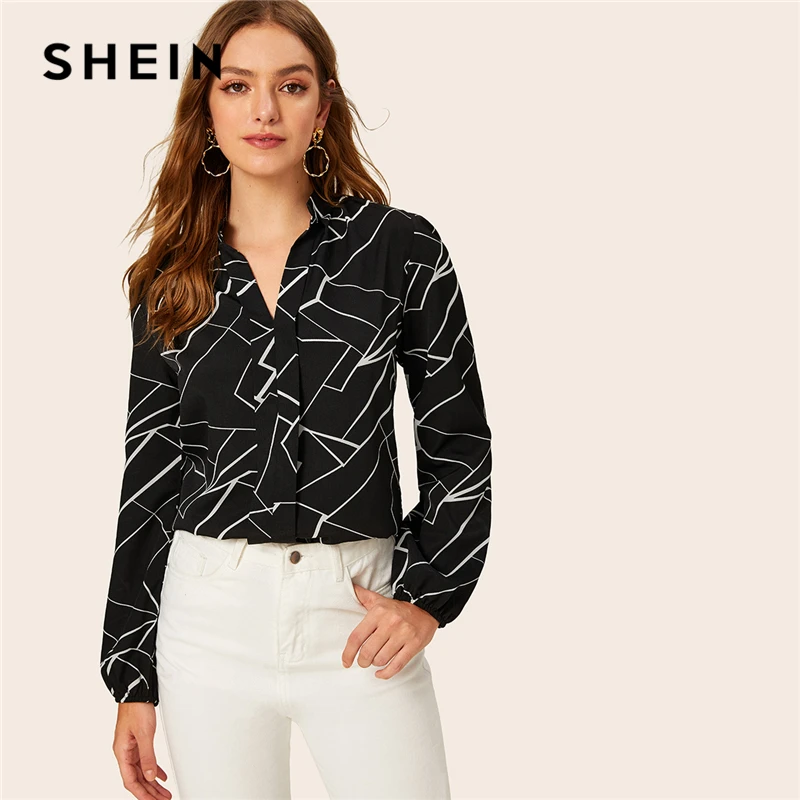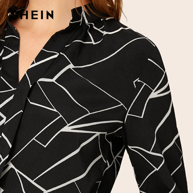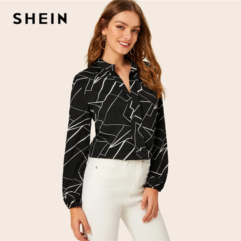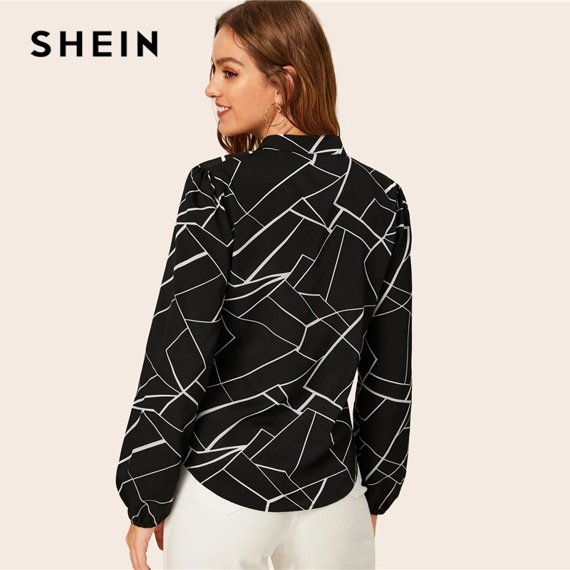 Ideal SHEIN Turn Down Collar Random Stripe Print Elegant Blouse Shirt Women Tops 2019 Autumn Black Long S