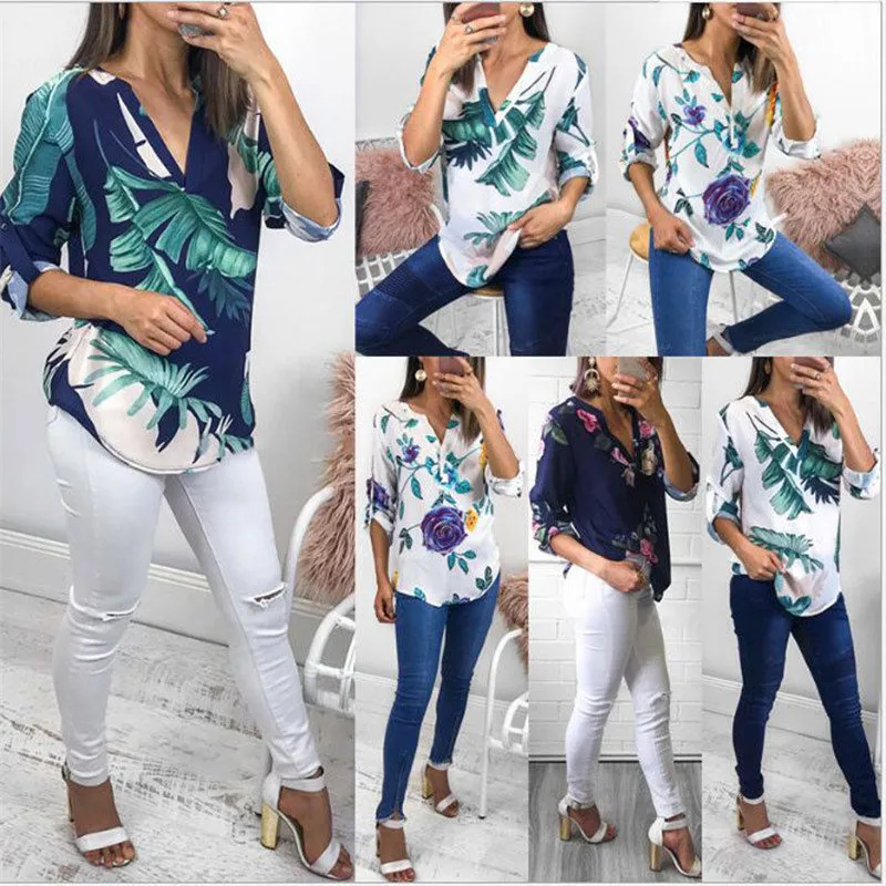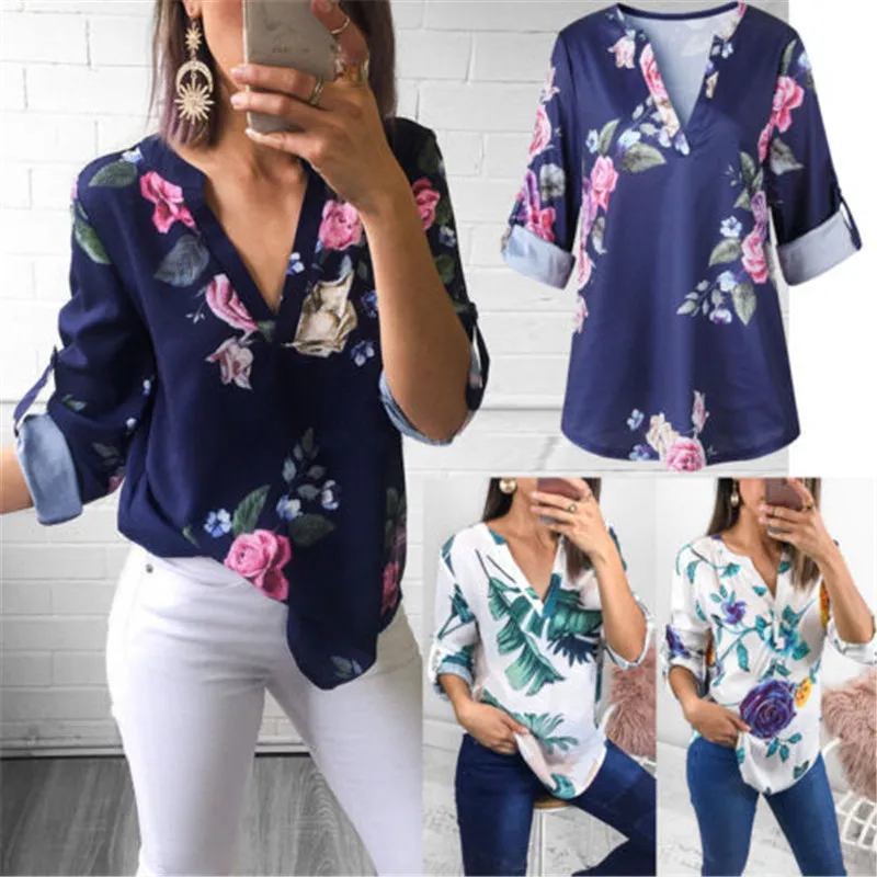 astounding 2018 New Womens Long Sleeve V neck Floral Print Tops Fashion Ladies Summer Casual Blouse Loose Shir