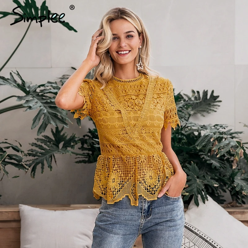 Very best Simplee Elegant lace embroidery women blouse shirt Short sleeve hollow out female peplum top shirt