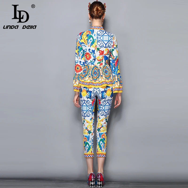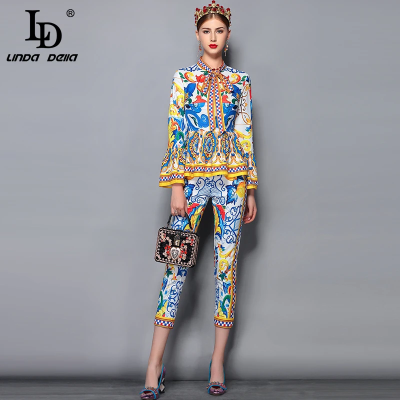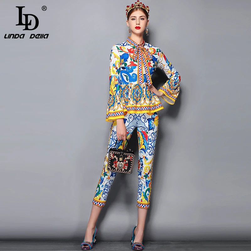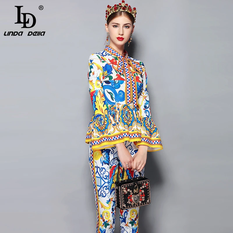 buy LD LINDA DELLA Fashion Runway Pants Suit Sets Women's Flare Sleeve Bow Collar Print Blouses and Cas