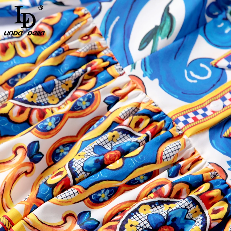 amazing LD LINDA DELLA Fashion Runway Pants Suit Sets Women's Flare Sleeve Bow Collar Print Blouses and Cas