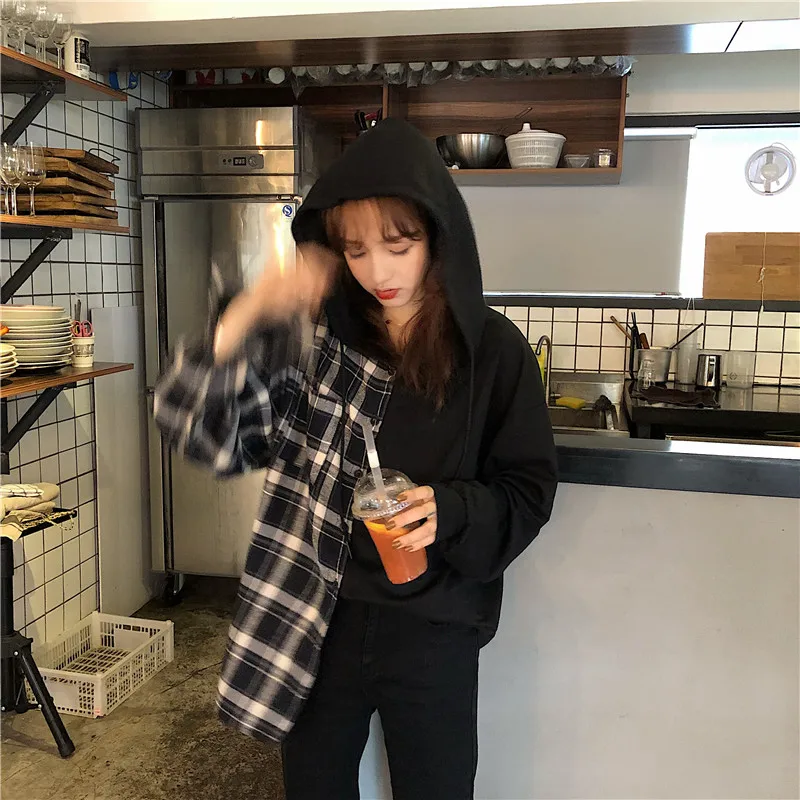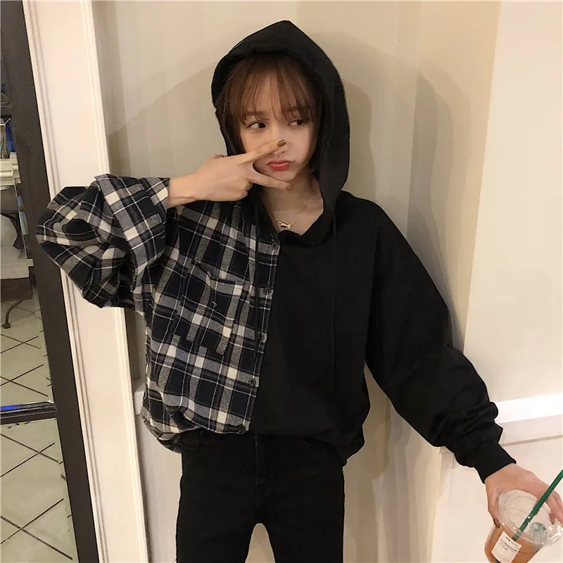 Best Shirts Women Irregular Loose Plaid Fake Two Piece Hooded Leisure Womens Long Sleeve Harajuku Blouse