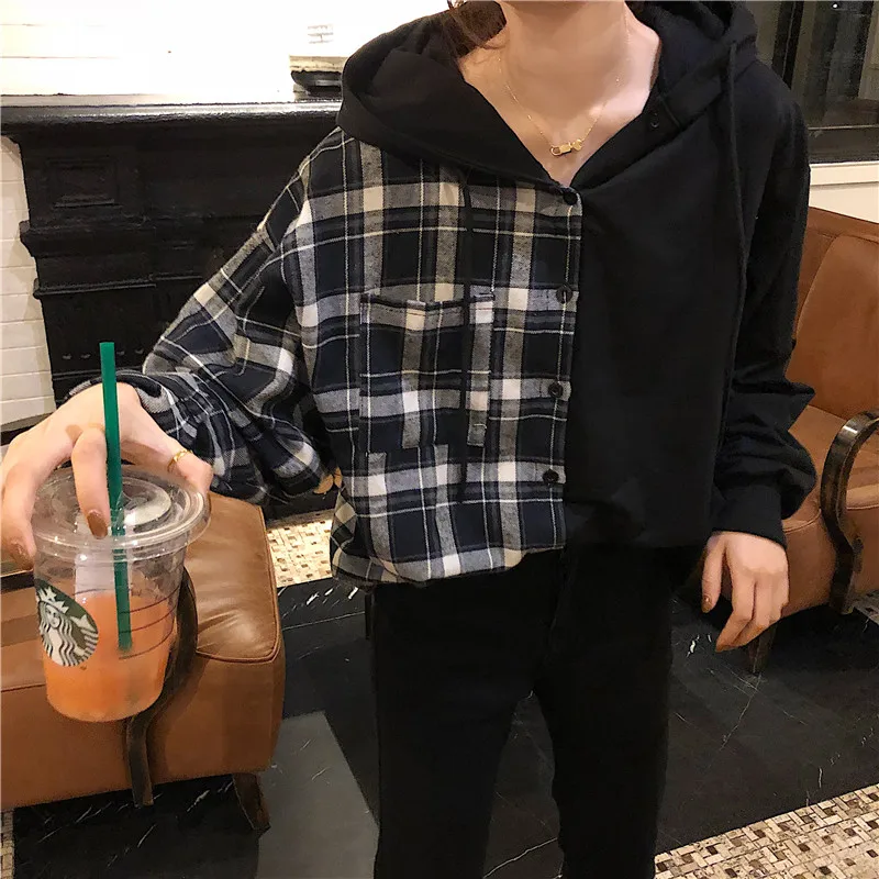 buy Shirts Women Irregular Loose Plaid Fake Two Piece Hooded Leisure Womens Long Sleeve Harajuku Blouse