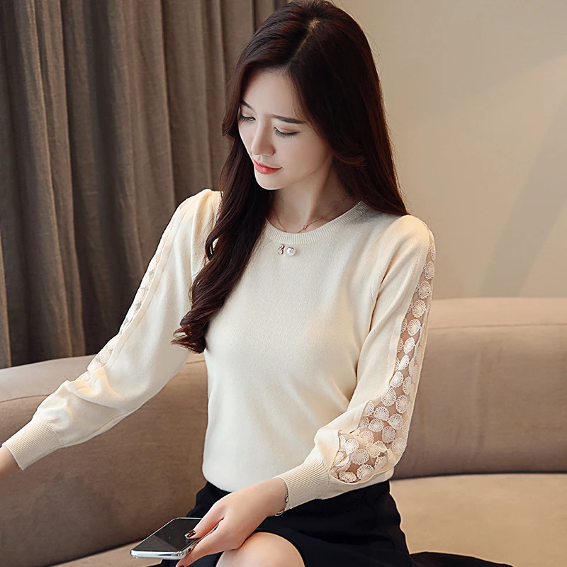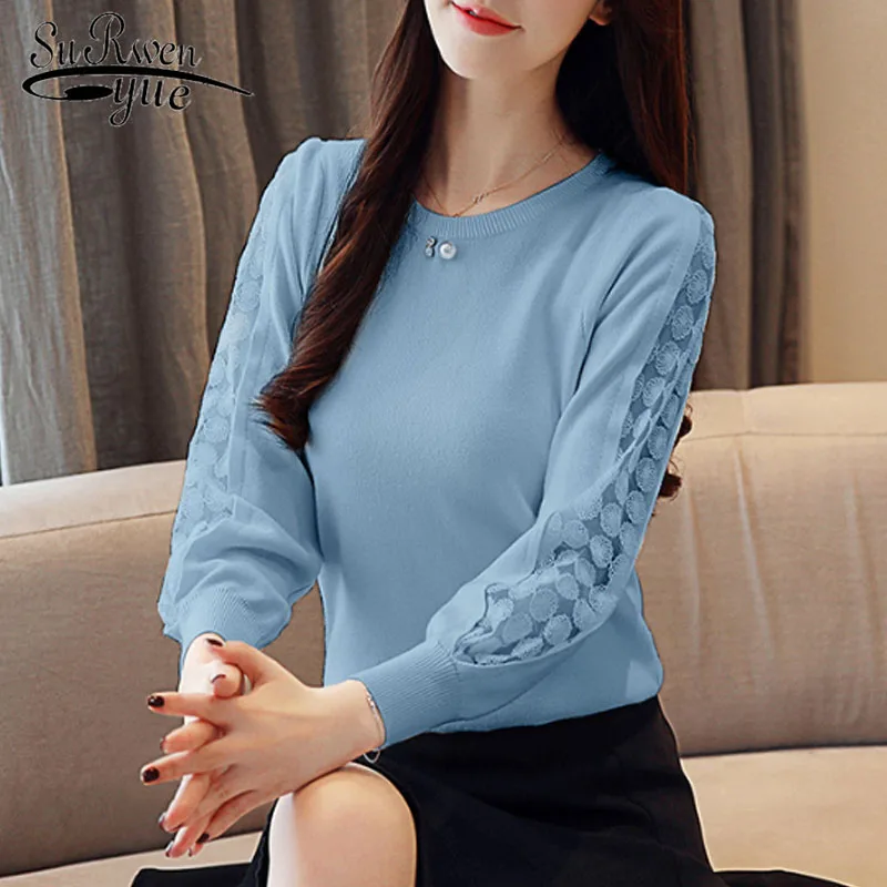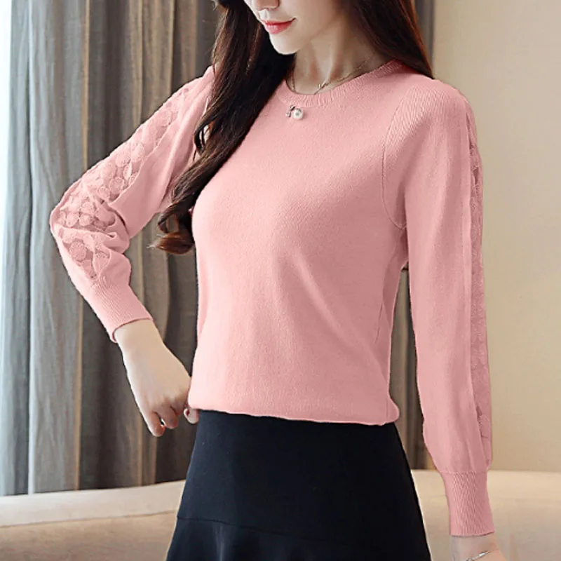 discount Casual Lace Solid Women Clothing Elegant 2019 Autumn Fashion Women Blouses Long Sleeve O-neck Women