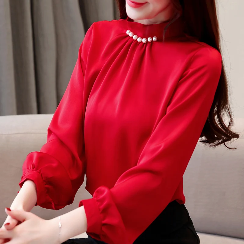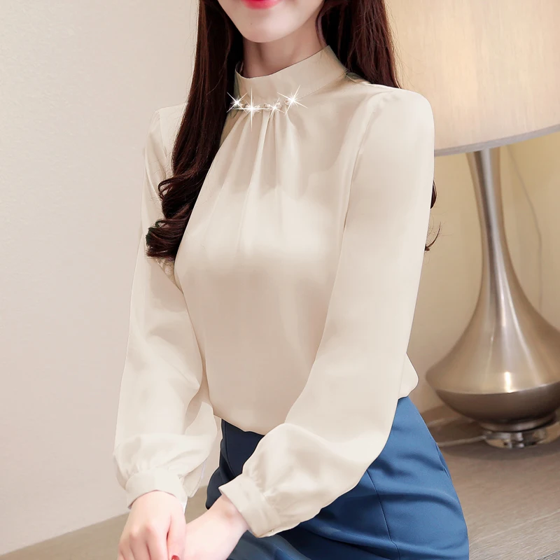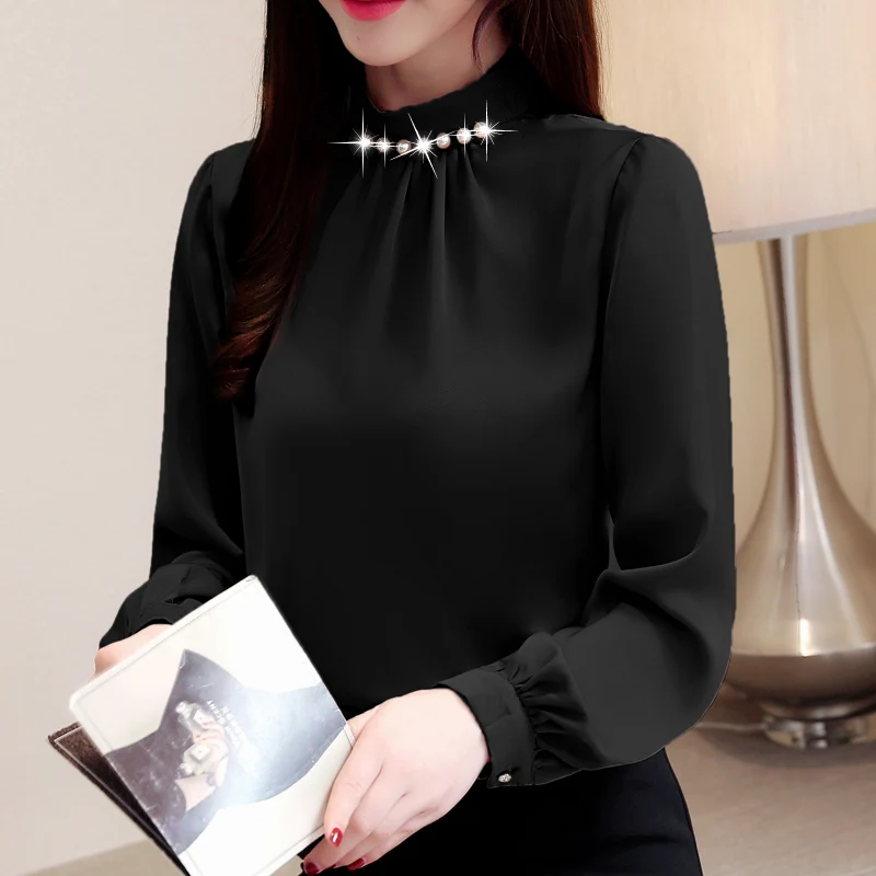 wonderful Fashion womens tops and blouses beading stand collar office blouse women chiffon blouse shirt long