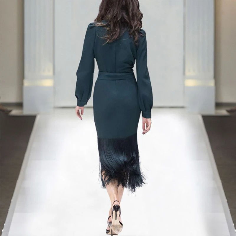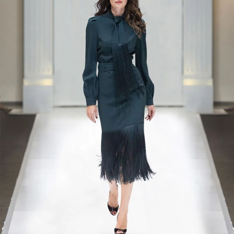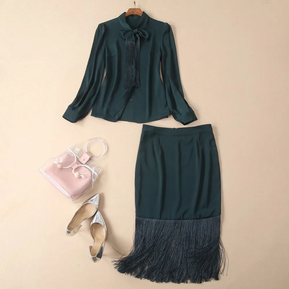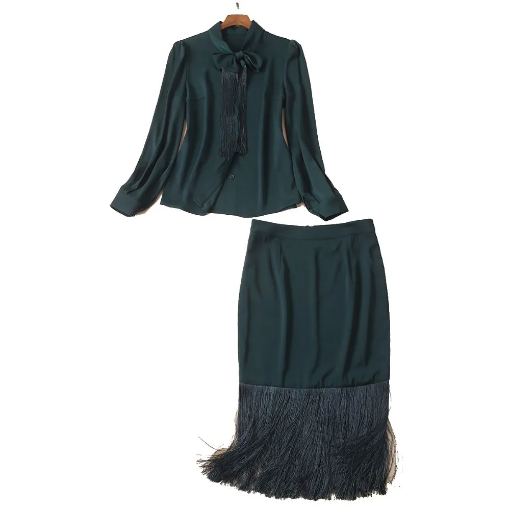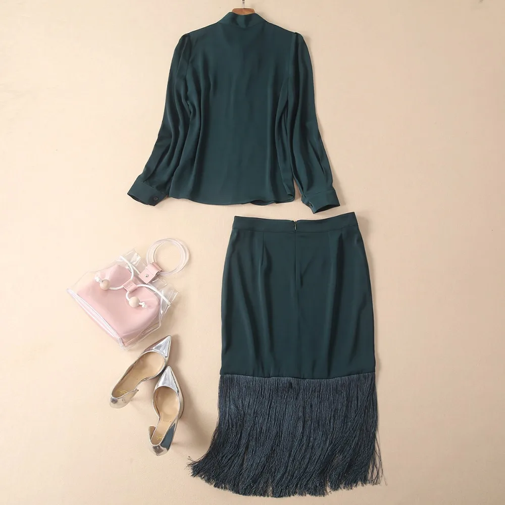 Greatest Unique Design Women Elegant Slim Two Pieces Set Solid Color Blouse Skinny Skirt High Street Tassel