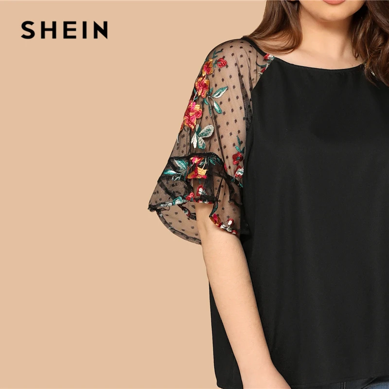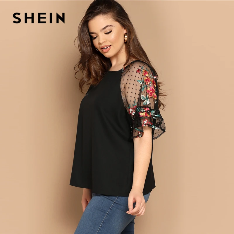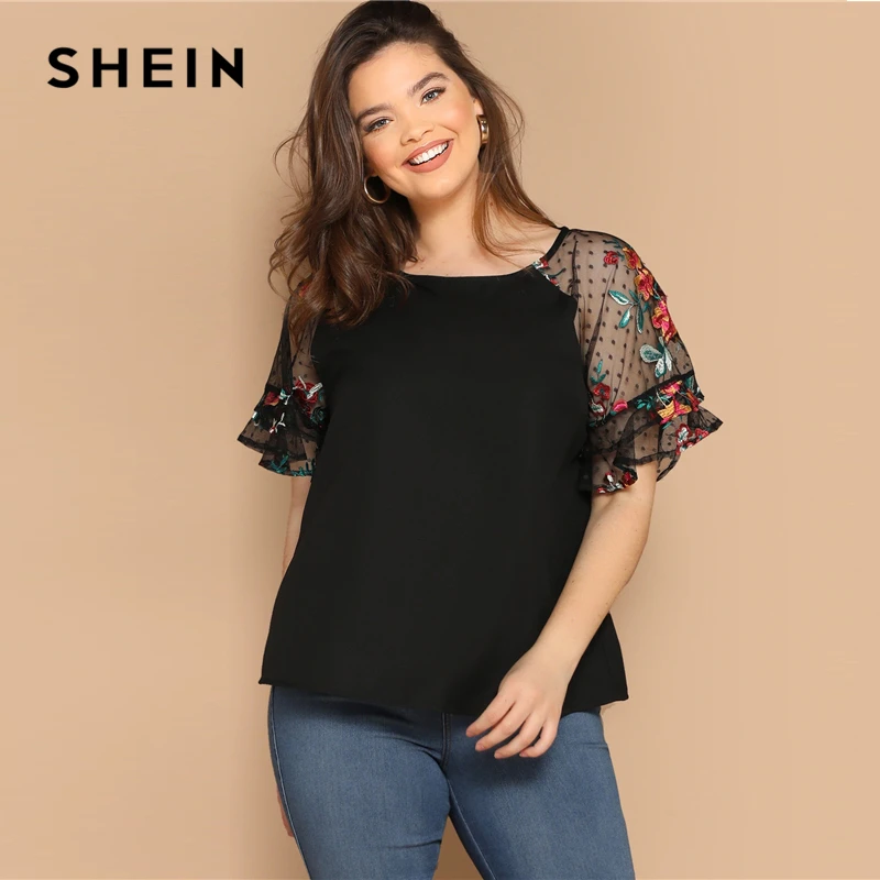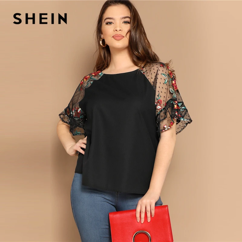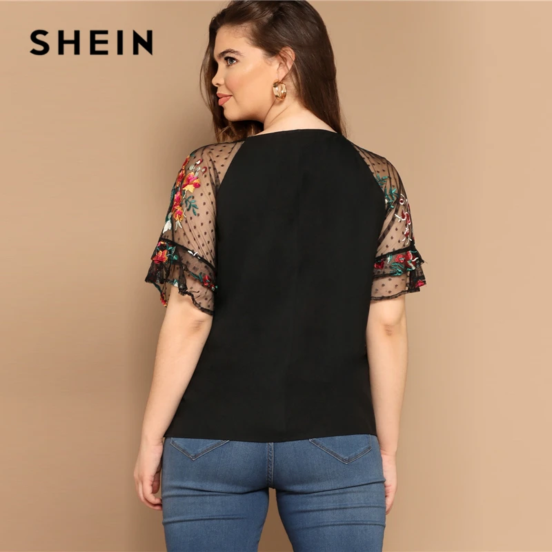Greatest SHEIN Plus Size Black Flower Embroidery Mesh Sleeve Top Blouse Women Summer Elegant Short Sleeve Sh