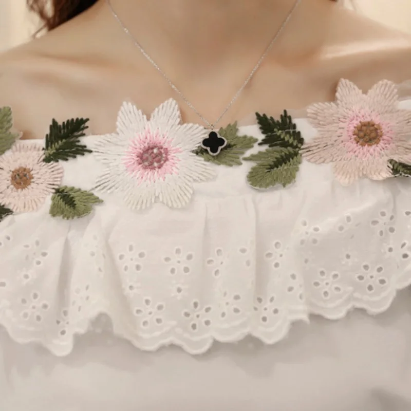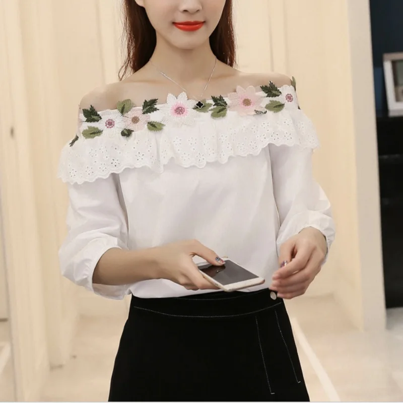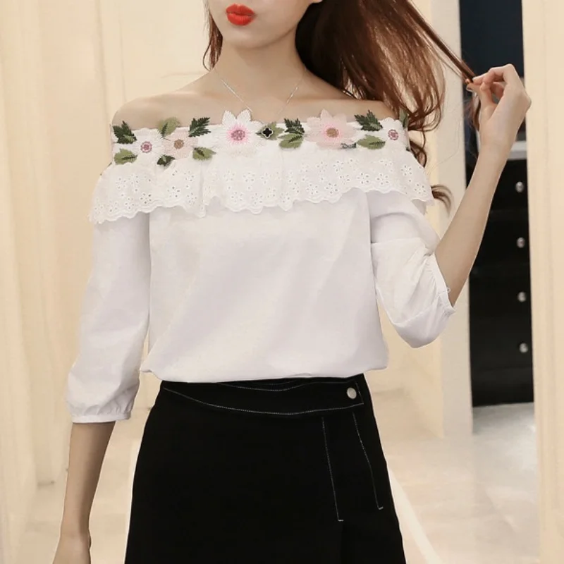 astounding EFINNY Girls Embroidered Flower Neck Slash Blouse Women Off Shoulder three Quarter White Blouse