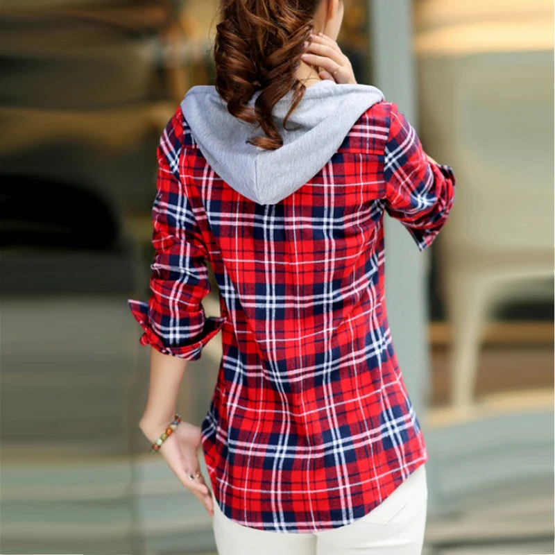 lower price Autumn Women Striped Flannel Shirts Long Sleeve With Hoodie Brand Cotton Blouses Spring Fashion Top