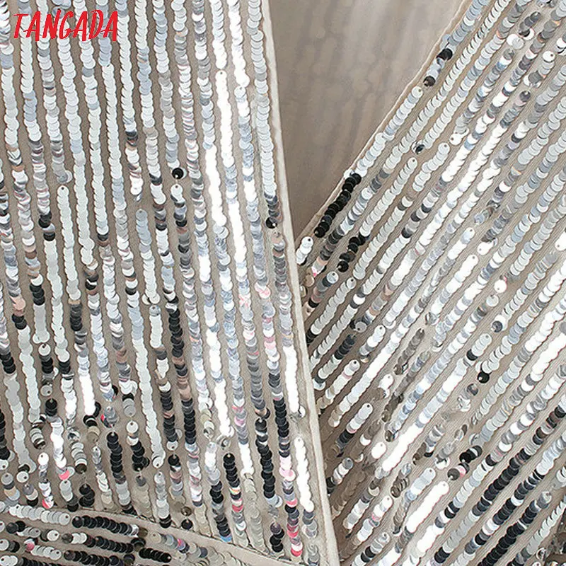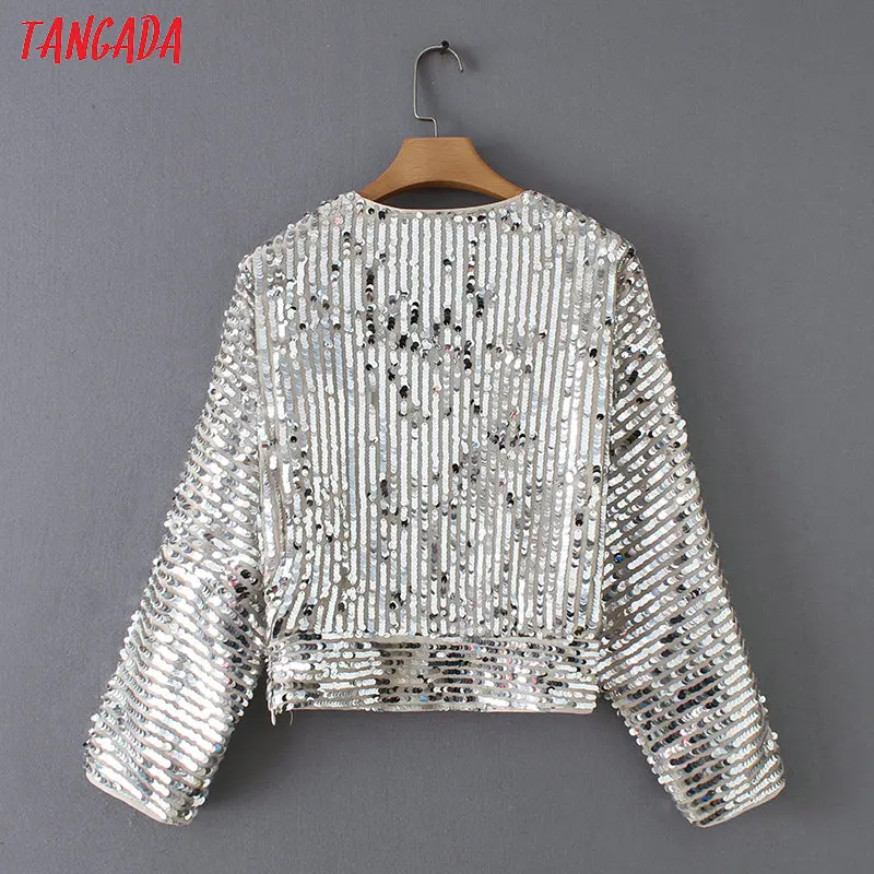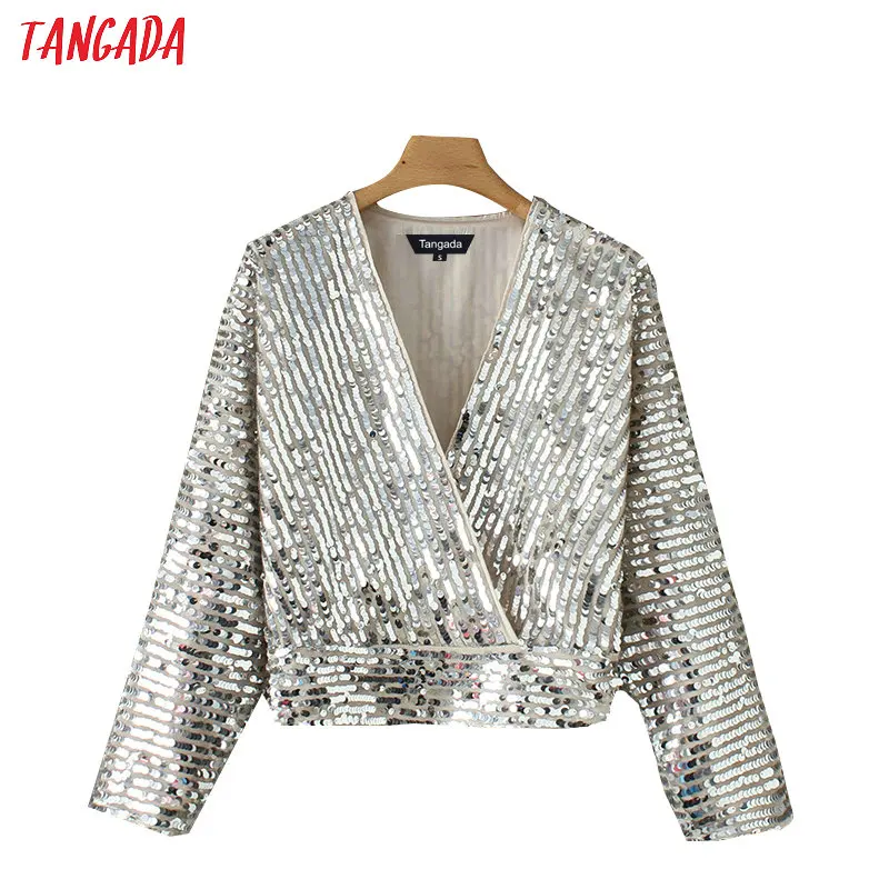 discounted Tangada women silver kimono blouse sequined korean chic long sleeve v-neck crop shirt europe sexy p