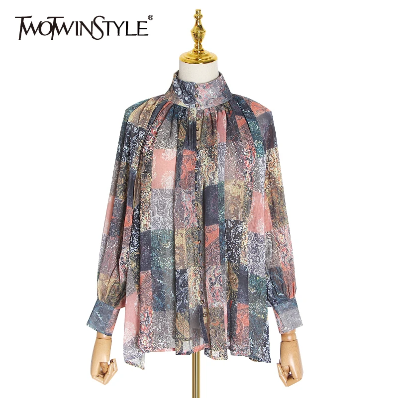 astounding TWOTWINSTYLE Vintage Print Long Lantern Sleeve Stand Neck Single Breasted Blouse Women Shirt 2019 F