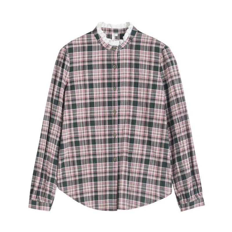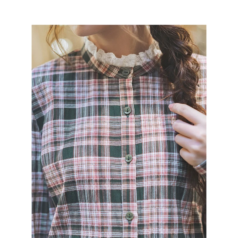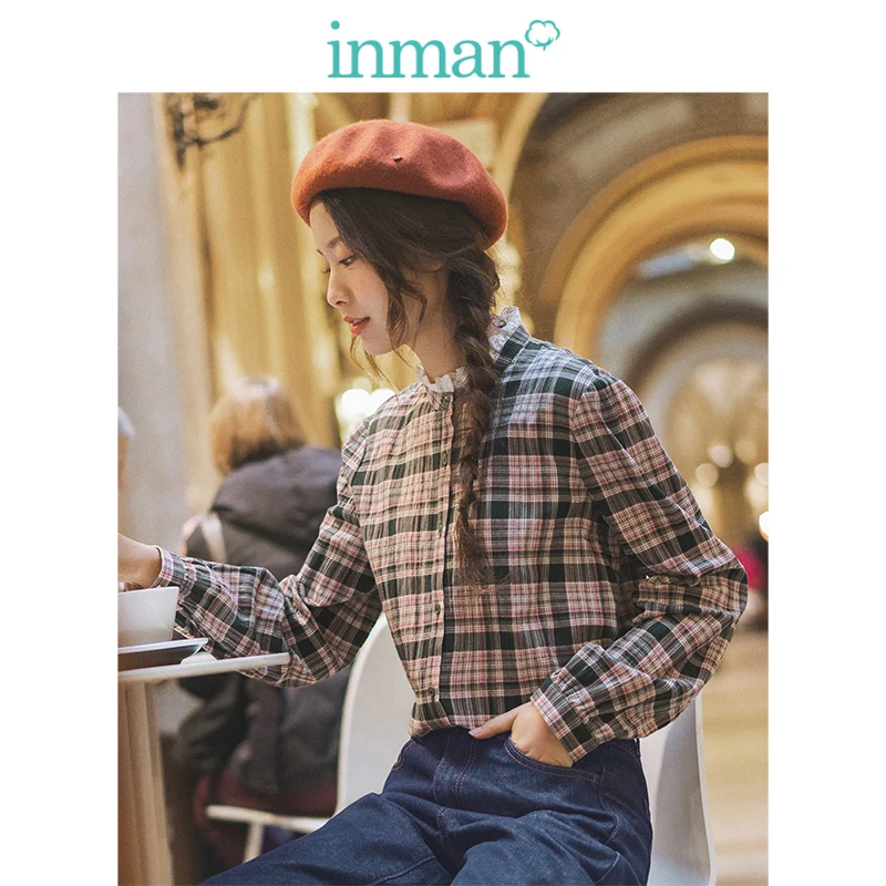 lower price INMAN Spring Autumn Lace Stand up Collar Casual Long Sleeve Retro Slim Plaid Literary Women Blouse