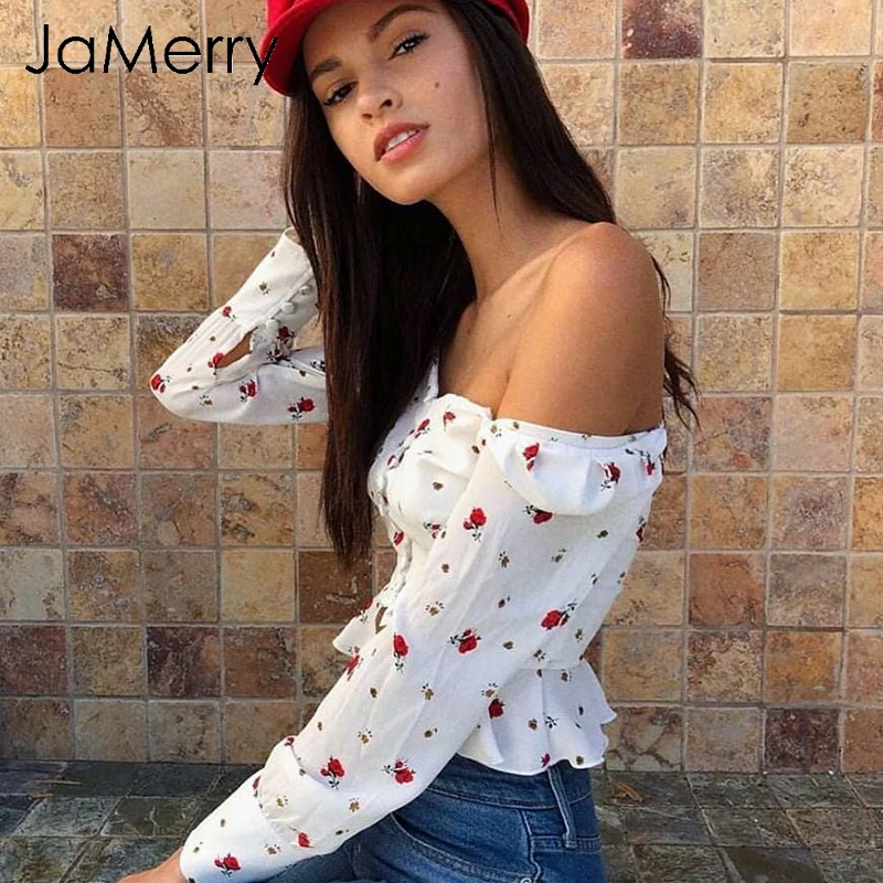 remarkable JaMerry Elegant white blouse women shirts 2019 Vintage flower print blouse tops summer Casual ruffl