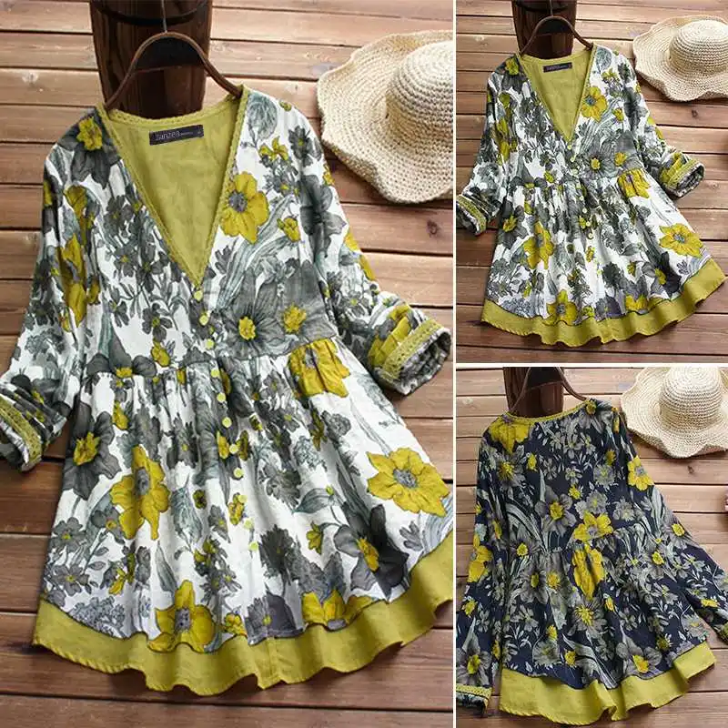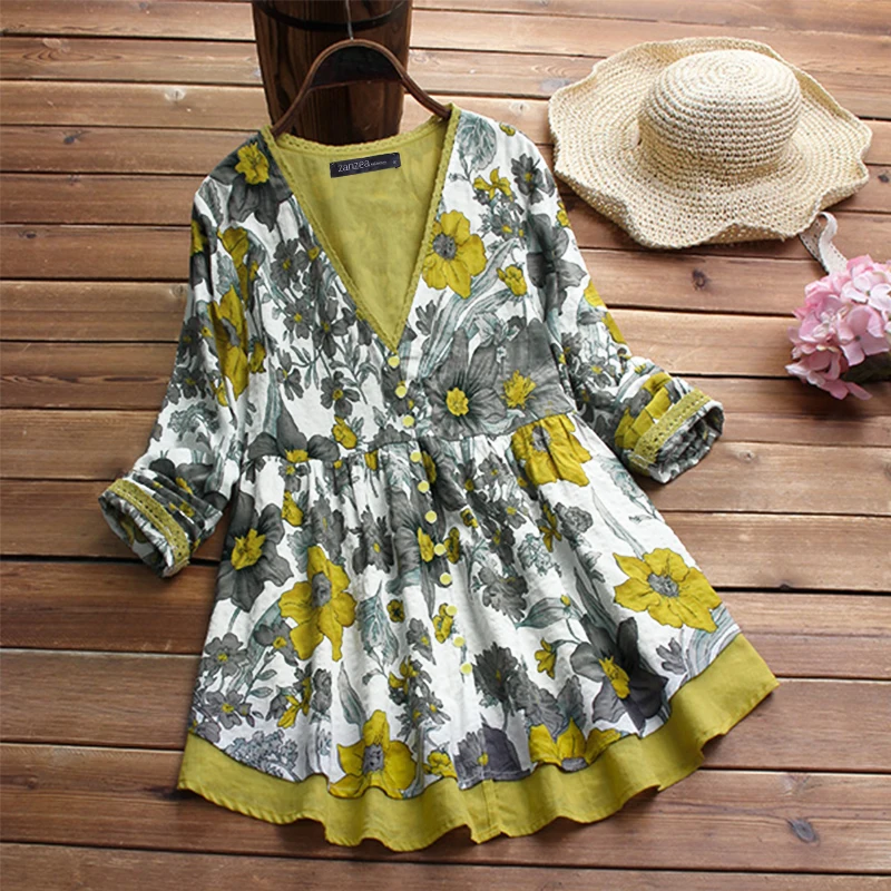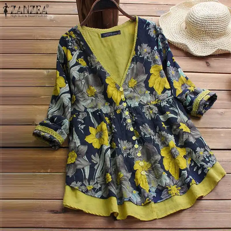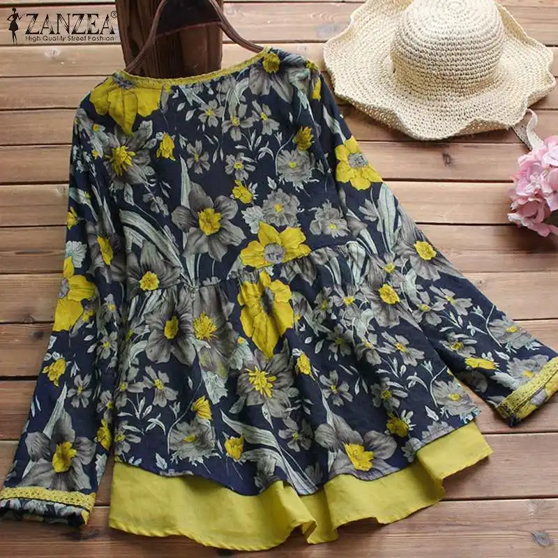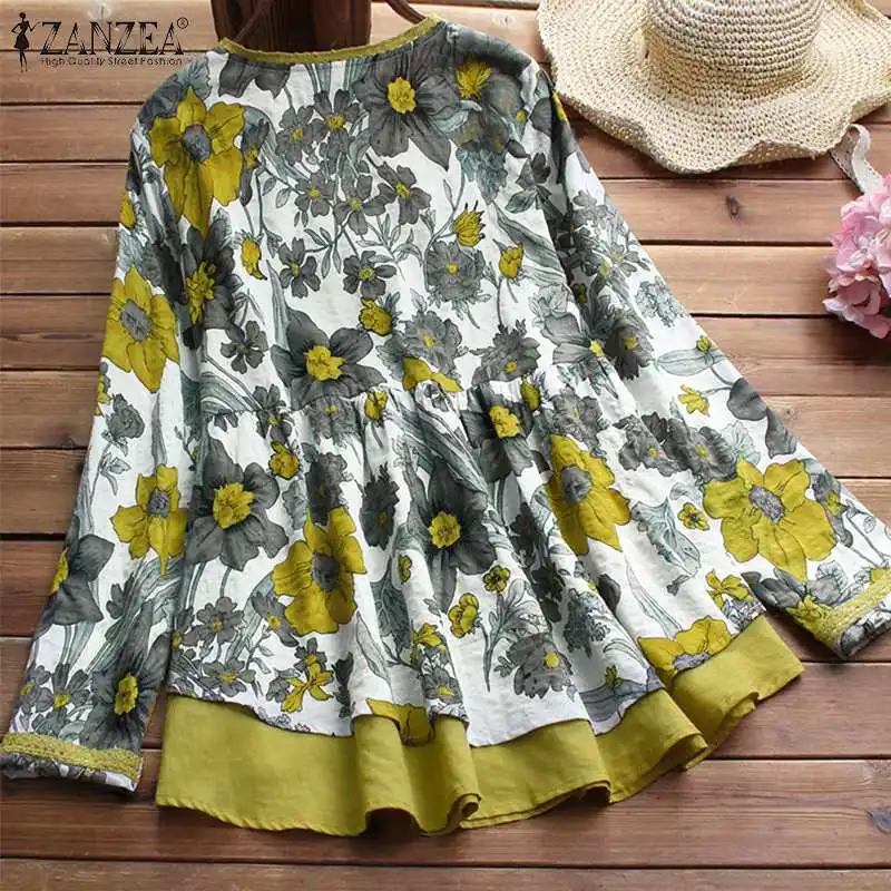 remarkable 2019 ZANZEA Women's Floral Shirts Fashion Print Blouse Long Sleeve Top Patchwork Blusa Female V Nec