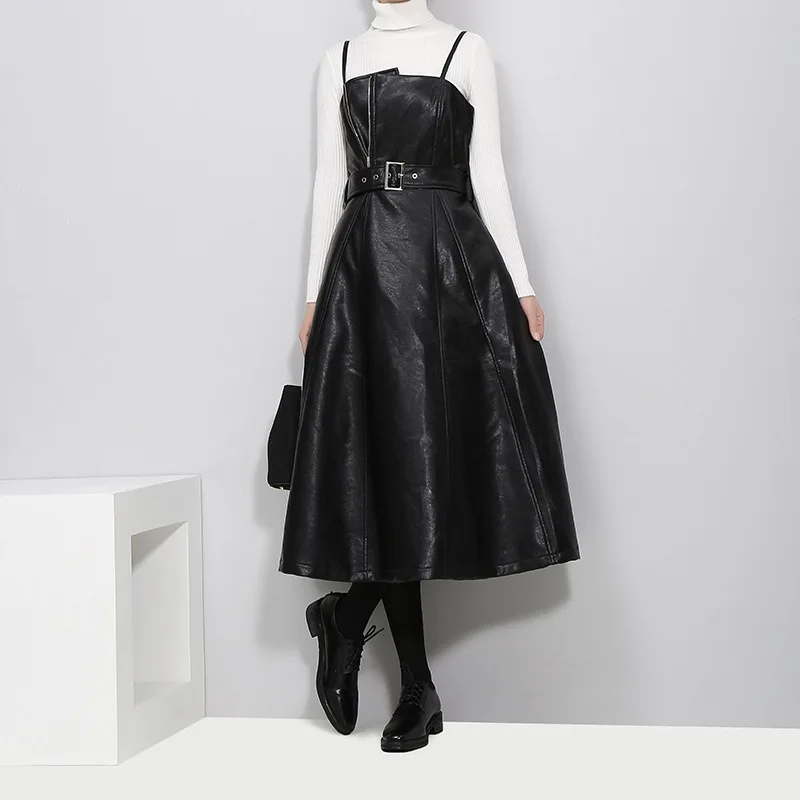 Greatest [EAM] 2020 New Autumn Winter Solid Color Strapless Black PU Leather High Waist Belt Zipper Loose Dr